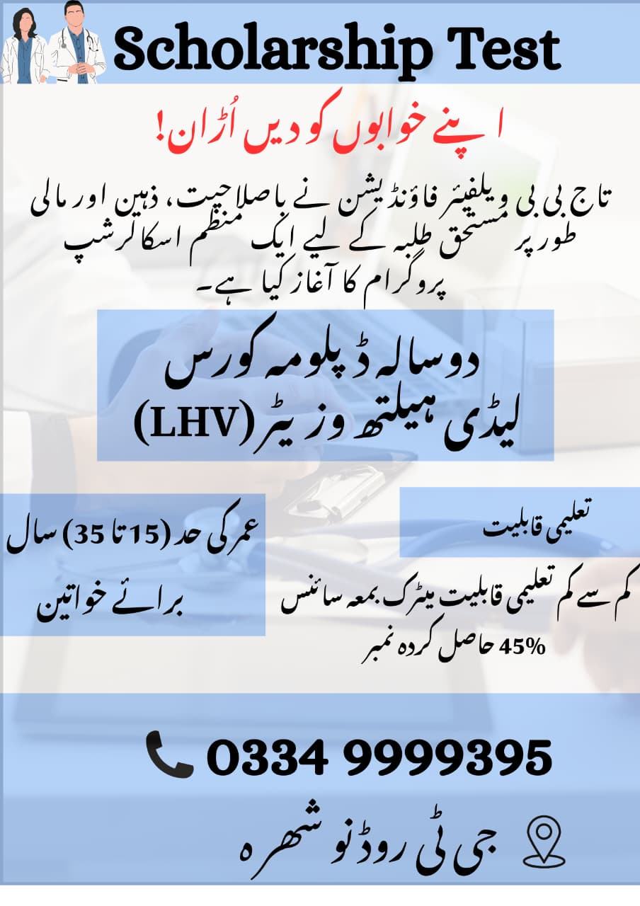 تاج بی بی ویلفیئر فاؤنڈیشن کی طرف سے ہونہار اور مستحق طالبات کے لیے دو سالہ لیڈی ہیلتھ وزیٹر (LHV) ڈپلومہ کورس کا خصوصی اسکالرشپ پروگرام۔ ✅ اہلیت: میٹرک سائنس، کم از کم 45% نمبر 🎯 عمر کی حد: 15 سے 35 سال 🗓️ ٹیسٹ کی تاریخ: 15 جون 2025 📍 محدود نشستیں — فوری رجسٹریشن کریں! 📞 رابطہ: 03005948401 03349999395