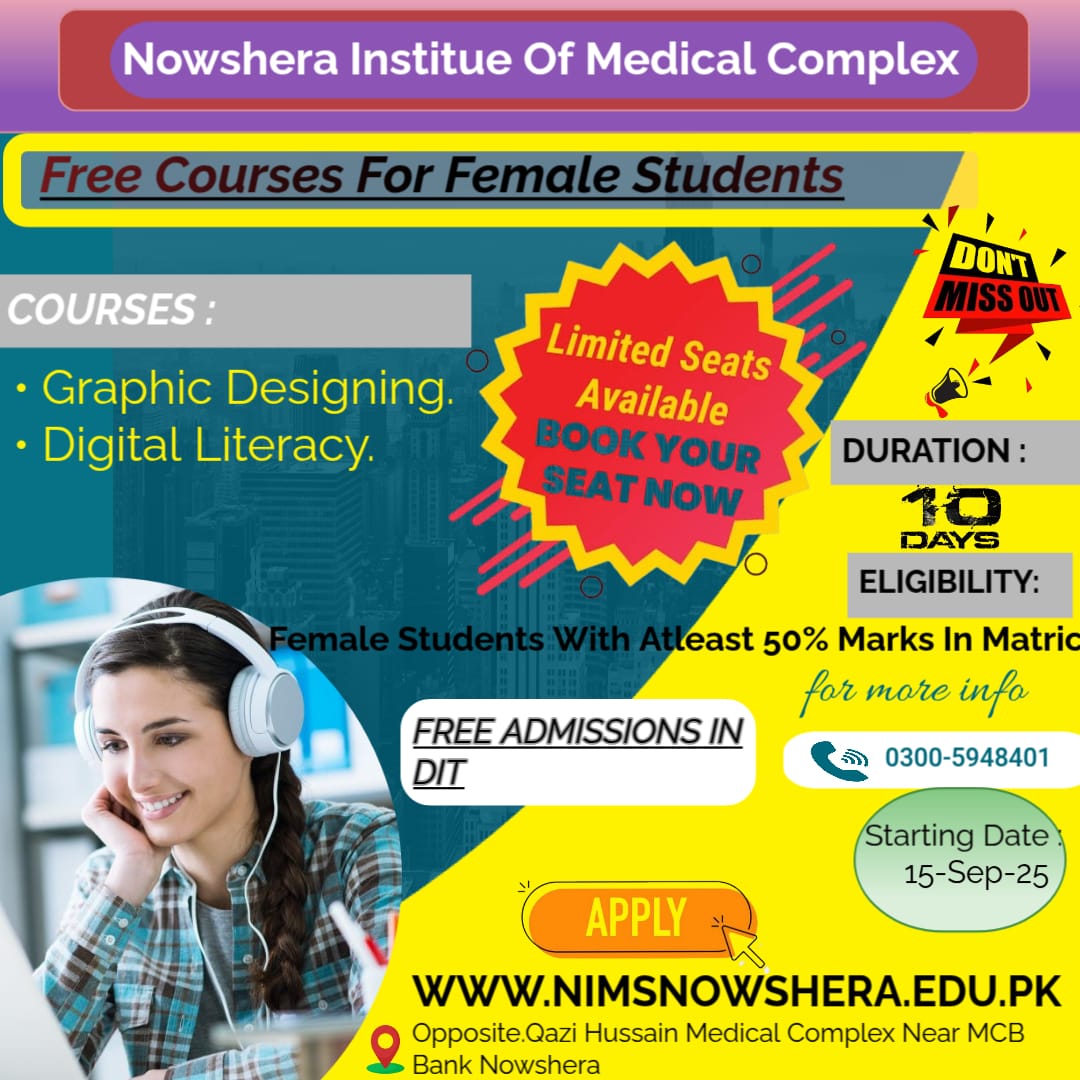 Free Admissions For Female Students Who Had Pass Thier Matric With 50 % Percentage